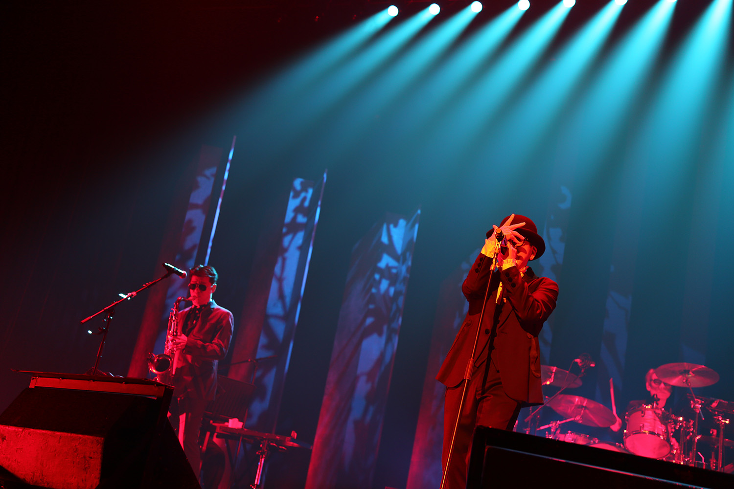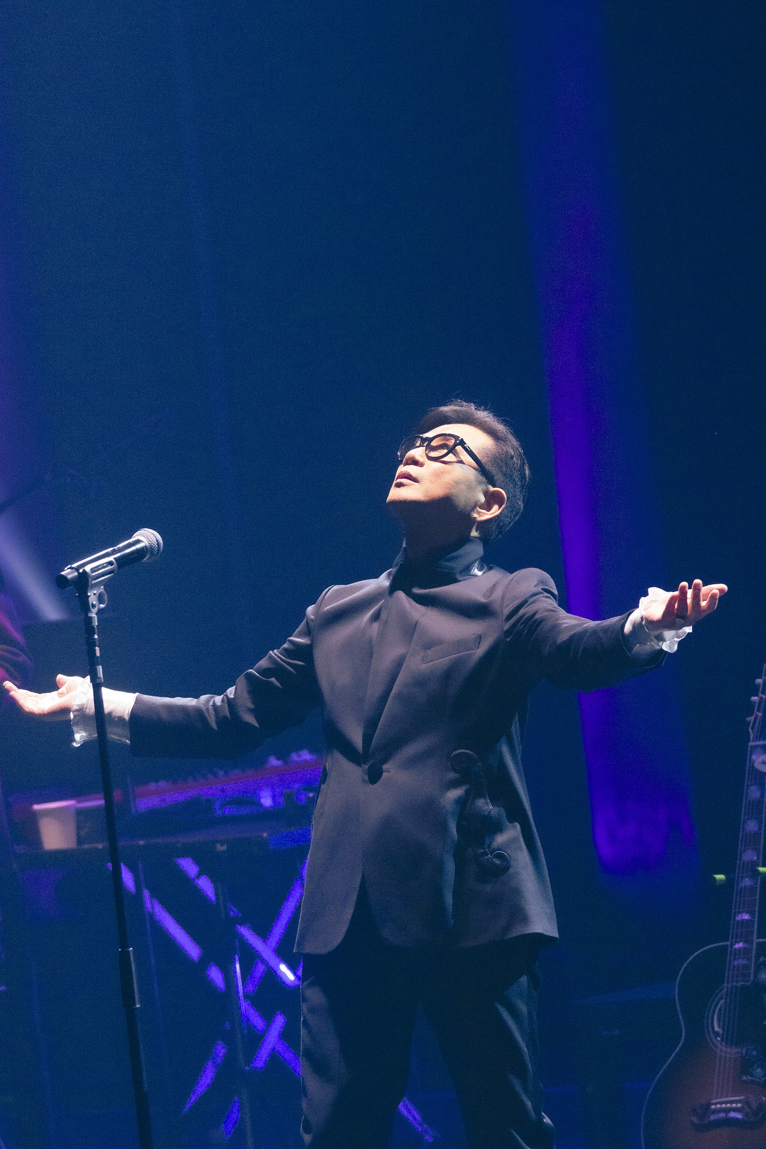 ●FUTATABIツアーでは、ソロはもちろんチェッカーズやF-BLOODを含むさまざまな楽曲が演奏されていますが、「水色と空色」は令和になってからの楽曲であり、過去の代表曲だけではなく、現在進行形としての藤井フミヤを表していると感じました。歌や歌詞に沿ったパフォーマンスが楽しみなのですが、フミヤさんがアウトロで舞台からハケた後、バンドメンバーの皆さんだけで繰り広げられる演奏も密かな楽しみです。グルーヴを感じられて、個人的に心地いい時間が流れています。(FF-084118 TAKASHI SASOU)